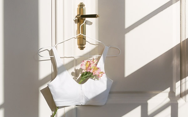 New cotton bra with front zip and back hook-and-eye closure, designed to facilitate mobility after surgery.
